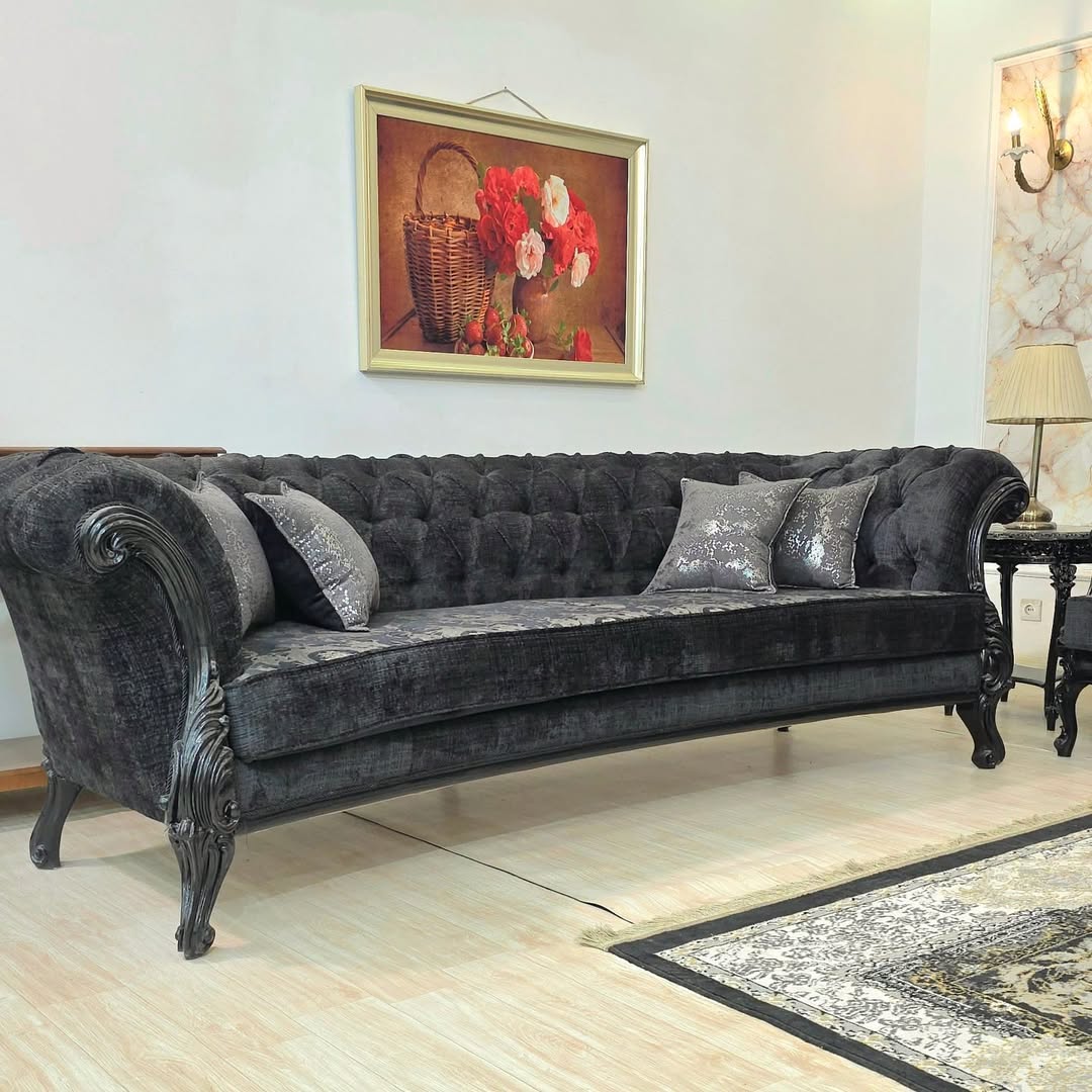 مدل خاص و کم نظیر شاهان با کاناپه شش نفره برای سهولت در جابجایی سه تکه طراحی و تولید شده و با پیچ به هم متصل شده است. پارچه کف ترک و پارچه تکیه گاه چین برای راحتی بیشتر، نشیمن اسفنج یورولوکس استفاده شده است. در مجموع نشیمن مبل ۱۲نفره شامل یک کاناپه شش نفره چستر چهارنفره دو مبل تک جلومبلی و دو عسلی